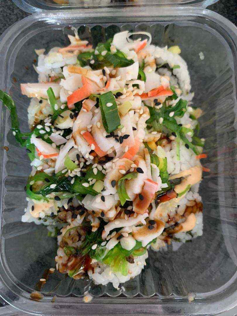 Cangrejo, queso crema, pepino, aguacate con topping de sushi salad (wakame, cangrejo, kani crocante y Aguacate) bañado en salsa de anguila
